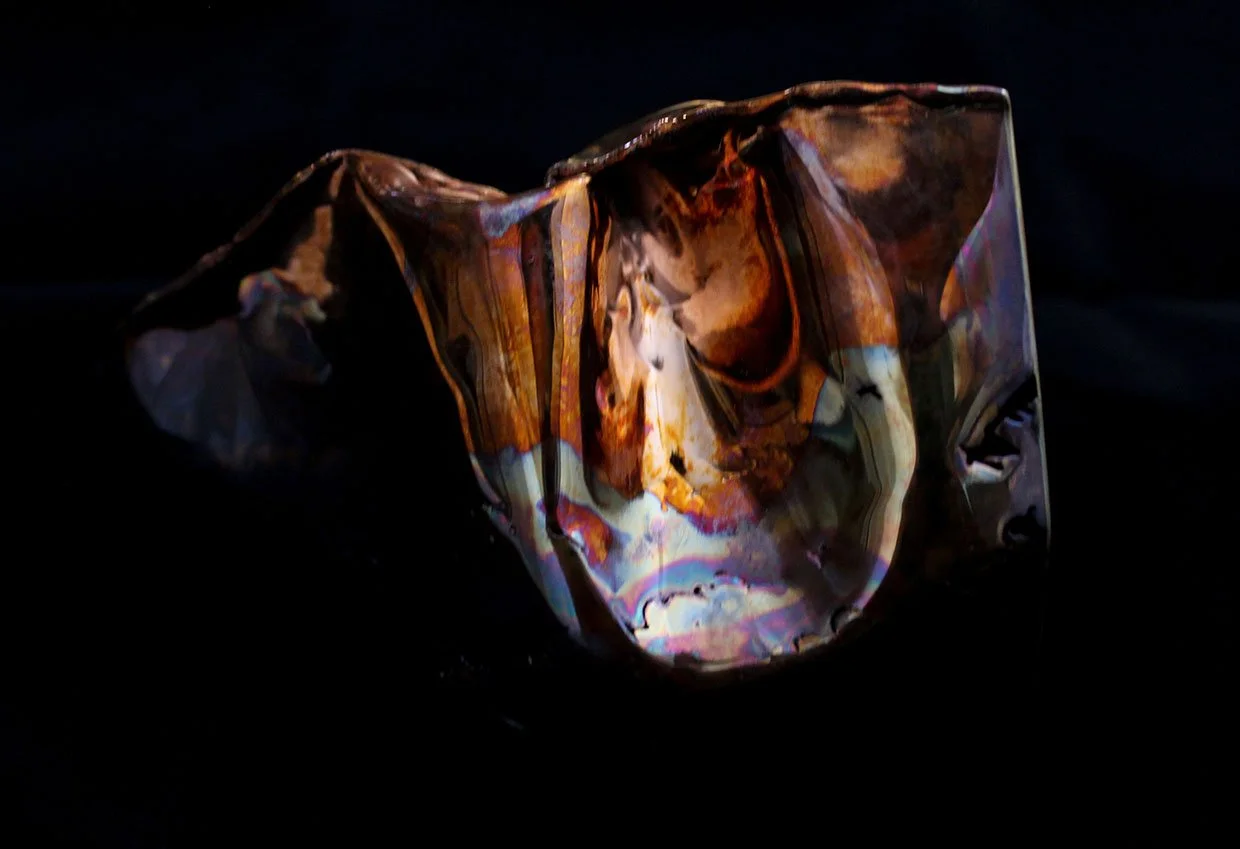 "My practice is multilayered with an emphasis on Metalwork; I explore a practice-led methodology, developing a multifaceted approach to object-making with a conceptual application by layering Film, Poetry and Photography to further explore narrative through the medium. With this methodological approach, I navigate the field through the hydroforming process by engaging in the disruption of making metal objects. By positioning Hydroforming into metal object-making, I explore the 'other' and the ideas of the 'imperfect' objects. The objects are primarily formed by water and pressure, which allows me to draw parallels to the body; the outcomes carry a disruption and require repair and often patination to highlight the contours the process has burdened the material with. My research is navigating within contemporary Metalwork by combining traditional and non-traditional making practices—the process used creates a pressurised environment drawing parallels to the plight of the diasporic over time."